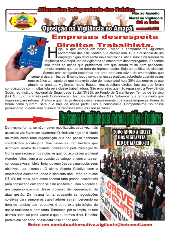 É triste mais é necessário chegar ao conhecimento dos trabalhadores. Depois de impulsionar as principais lutar dos trabalhadores vigilantes que prestava serviço no contrato da educação (SEED), Pela empresa Amapá Vip. A direção do SINDIVIAP iniciou uma campanha com o objetivo de afastar do processo de luta O Claudio Gois, um dos principais lutador da categoria. Tentando colocar a categoria contra esse trabalhador, com varias acusações infundadas, sem nenhuma prova. Com o objetivo de defender interesses próprios. Mais isso falamos depois. Quero comunicar a todos da categoria que a partir do dia 01 /09/2011já não sou mais diretor sindical, pois entrei com minha rescisão indireta, porque já fazia 01 ano e 04 meses que não recebia meus pagamento da empresa Amapá vip.em virtude da formalização do presente,renunciei meu mandato em caráter irrevogável do cargo de diretor do sindicato dos vigilantes.